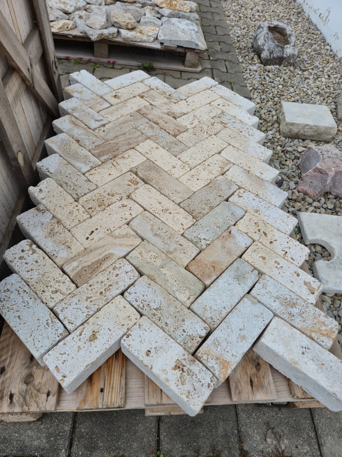 Pflastersteine Travertin in Fischgrätenmuster