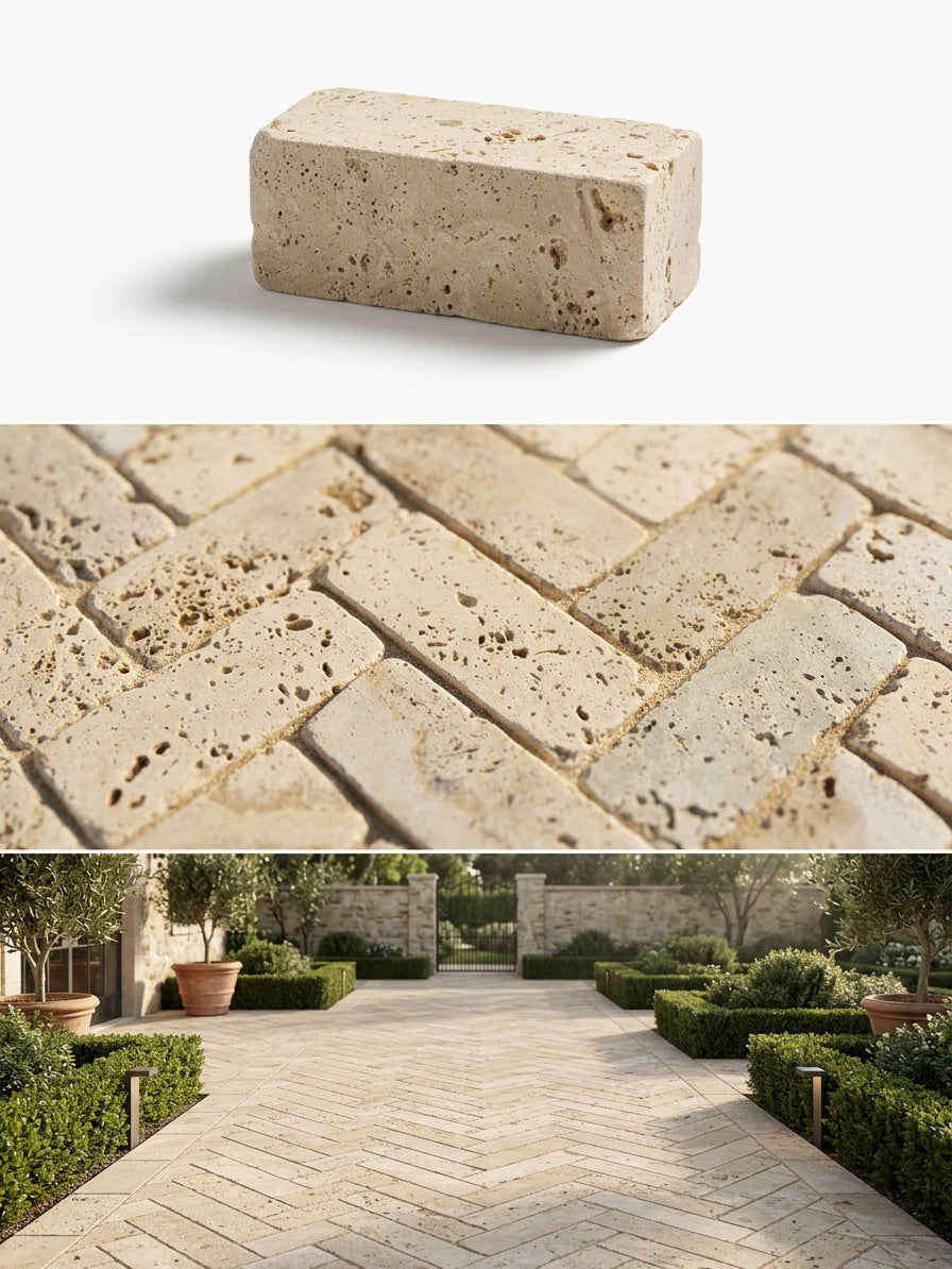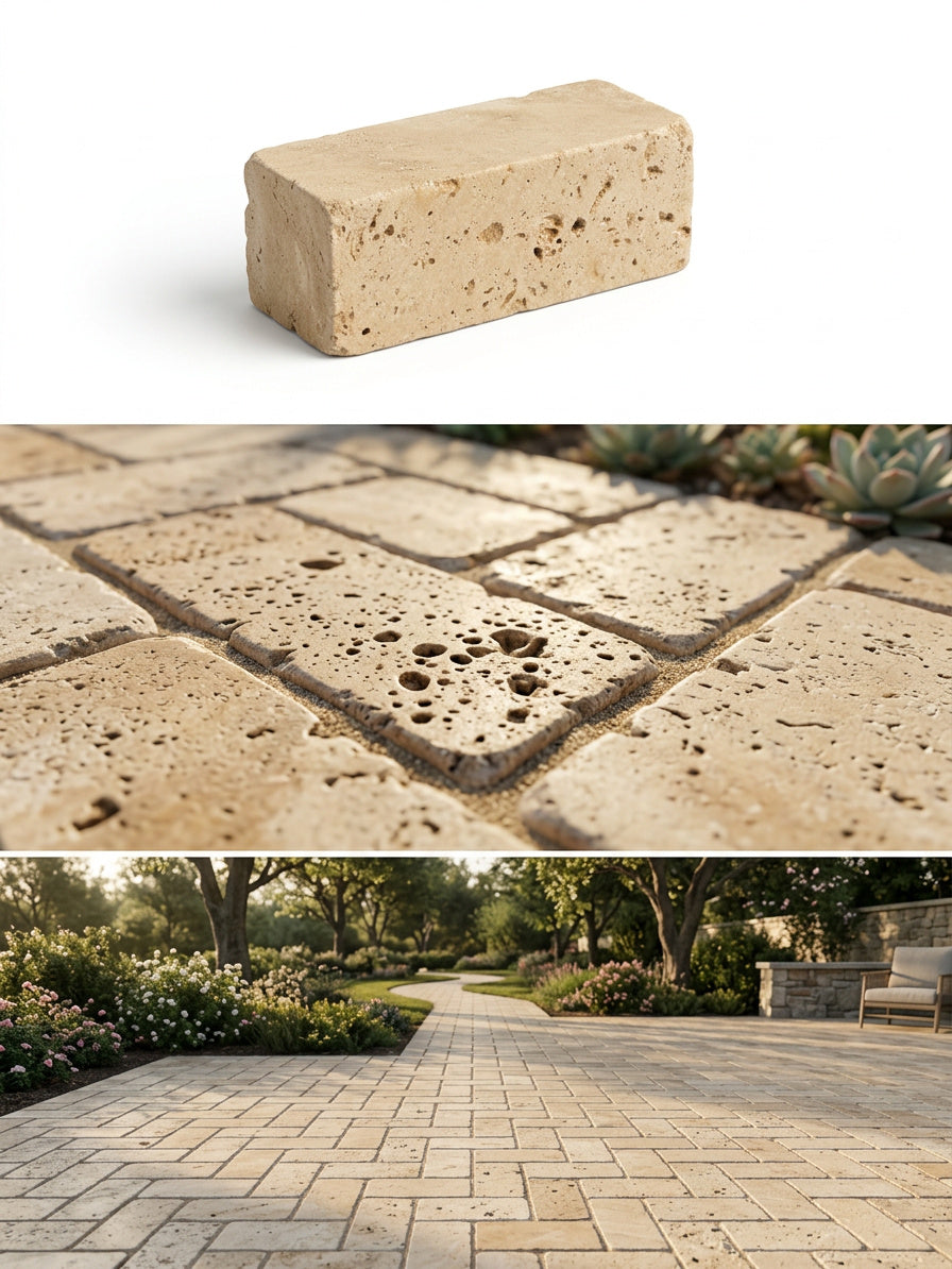 Pflastersteine aus Travertin verbinden natürliche Eleganz mit hoher Belastbarkeit und eignen sich ideal für Terrassen, Wege und Außenanlagen.